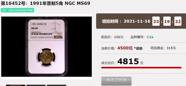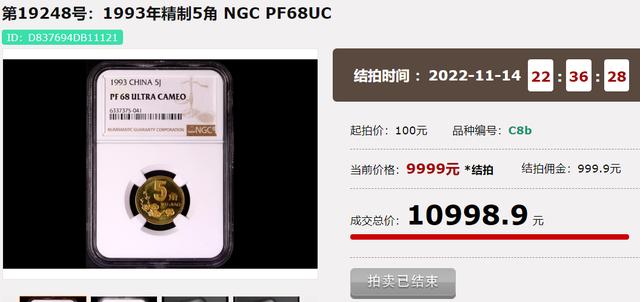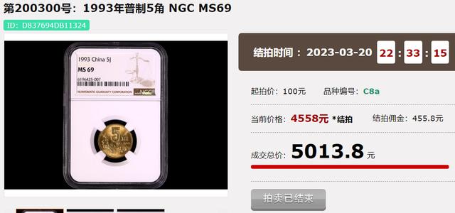 上面這一枚NGC69分的93年梅花5角,就在2023年的現代錢幣春拍中,拍出了5013.8,相比面值,已經能翻1萬多倍了。