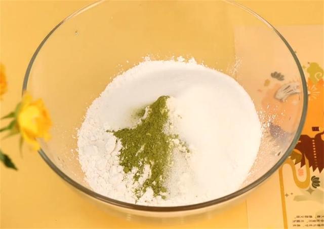 1.先把200g缽仔糕粉倒入大碗中,倒入10g斑斕粉,100g細砂糖。