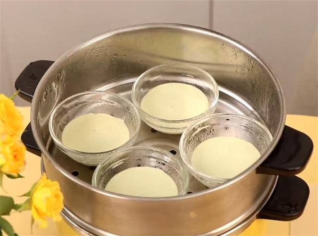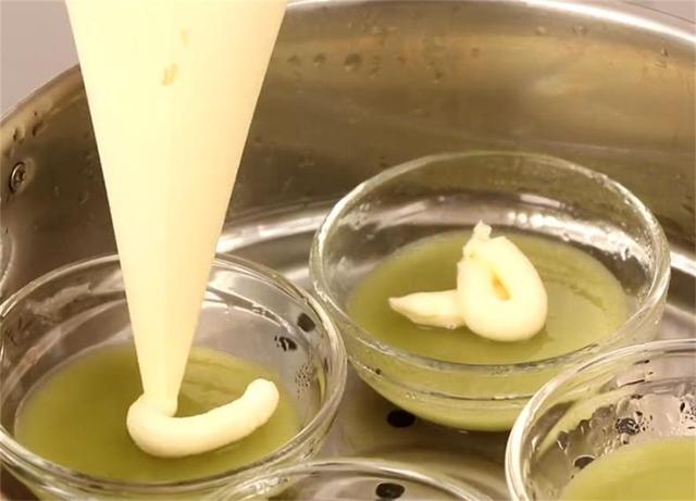 3.蒸鍋上汽,放入4個模具,倒入一半粉漿,蓋上蓋子蒸8分鐘左右。