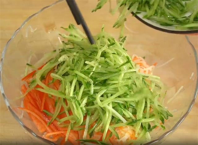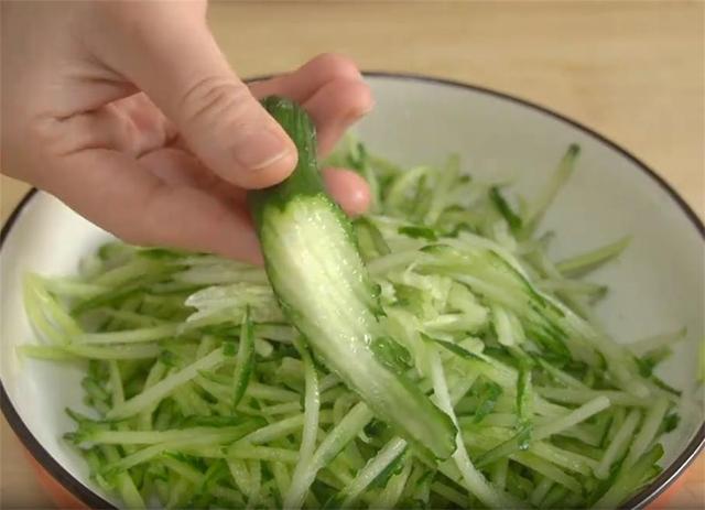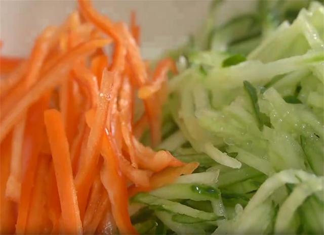 2.半根胡蘿卜擦成絲,洗干凈的黃瓜也擦成絲,如果你刀工好的話,用刀切我也不介意,剩下的黃瓜把也不要浪費(fèi),直接吃掉。