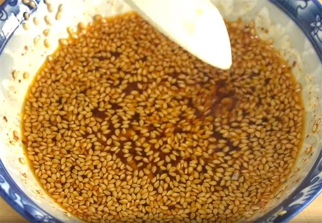 6.適量的大蒜切成末,再加入一勺辣椒面,一小勺花椒粉、一勺熟芝麻,再把燒到冒煙的熱油澆在上面,把香味激出來,先用筷子拌勻,最后調(diào)一下味,兩勺生抽,兩勺香醋,一勺味極鮮,一勺白糖,適量的鹽拌勻。