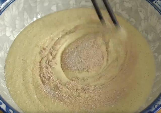 3.打好以后倒在一個大點的碗里,加入三克酵母粉,一勺白糖,加速發酵,先充分攪拌均勻。