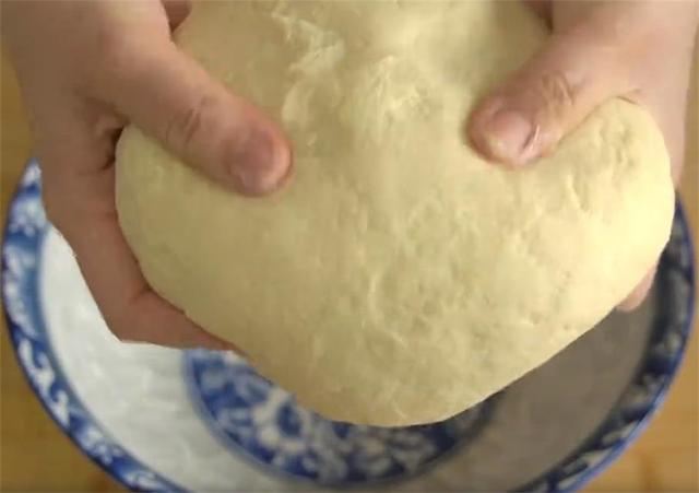 5.發好的面取出來揉一會兒,排出里面的空氣,再搟成一個長方形的大面片,不要搟的太厚,差不多像這樣就行了。