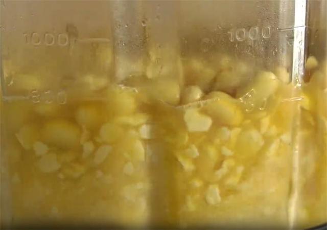 2.把它們撈出來控一下水分,裝在大碗里,再加入100毫升清水,攪勻后加一大勺鹽,全部倒入料理機里,選擇果汁鍵,把它們打成黃豆糊。