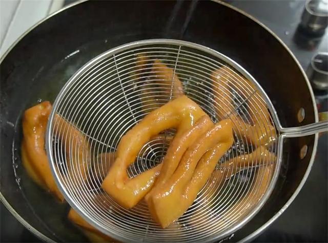 8.醒發好以后,用手拿起來感覺輕飄飄的,用一根萬能的筷子試一下油溫,周圍出現密集的小泡,改小火把醒發好的生胚下鍋,這樣油溫高點下鍋,表面定型會比較快,里面不會吸油,全程都要用小火來炸,大約兩分鐘左右,一面變得金黃,給它翻個面,直到炸成兩面都是金黃色就行了,大約需要五分鐘左右,撈出來控一下油。