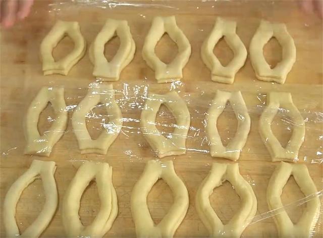 7.然后把兩個摞在一起,用刀子在中間劃一個口,再用手指把小口撐得更大一些,做好以后是這樣的,全部處理好以后,蓋上保鮮膜,二次醒發十分鐘。