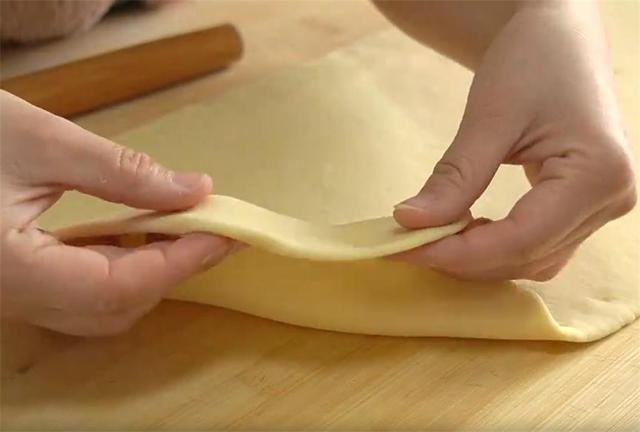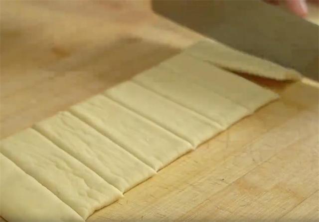 6.再把面片分成三等份,然后切成寬度約2厘米的長條大小,你也可以根據自己的喜好來。