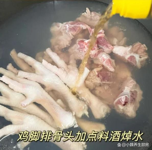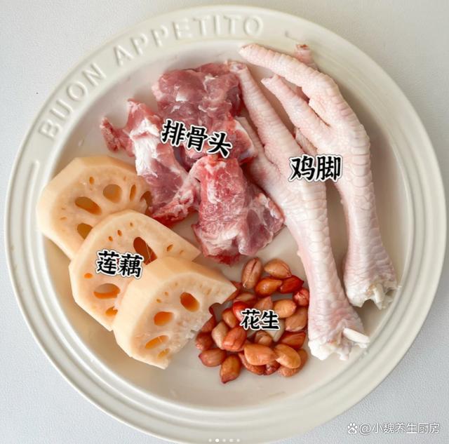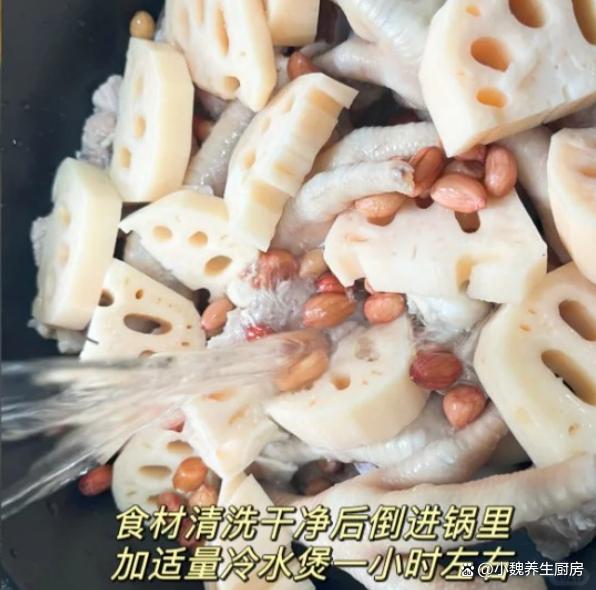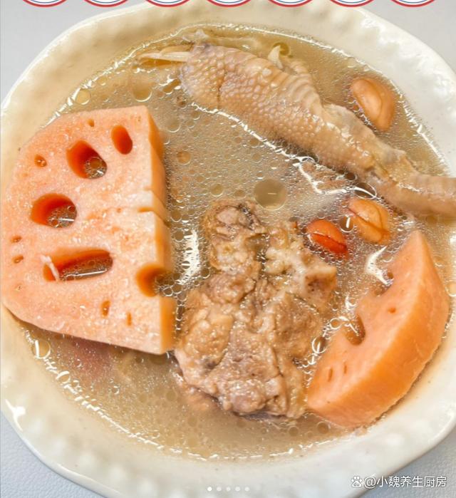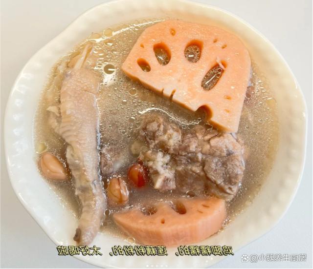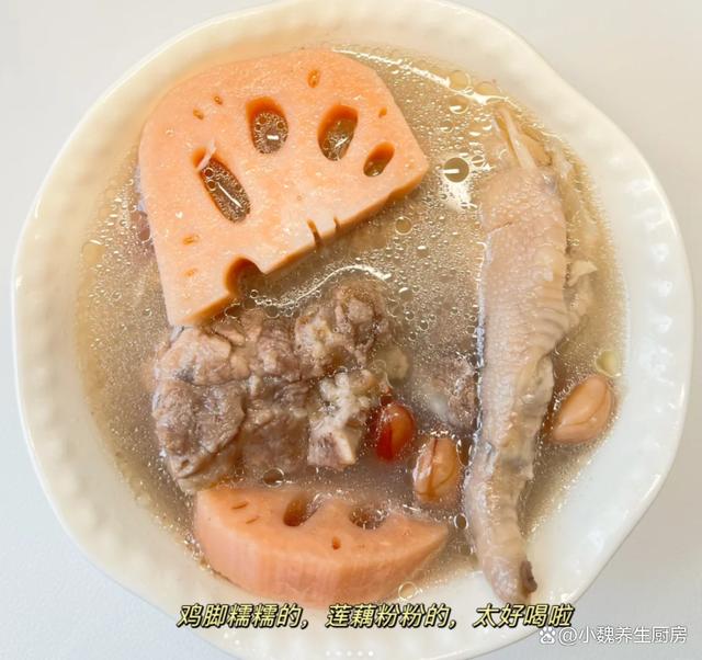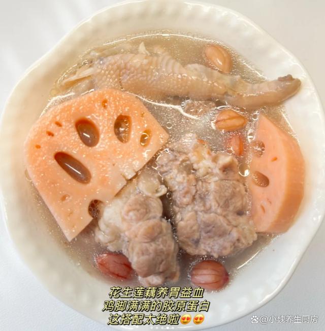 一轉眼就到了十月份,十月的前一周是假期,大家的空閑時間還非常多,但是天氣并不好,下雨后就降溫了,天冷后一定要增添衣物,平常多喝一些熱乎乎的湯品。很多人都在喝秋天的奶茶,湖北人喜歡喝秋天第一碗藕湯,湖北人對于藕湯非常情有獨鐘,今天準備搭配雞腳,豬骨和花生制作一款湯品——蓮藕花生雞腳豬骨湯,湯品特別鮮美,暖胃養胃,趕跑體內的寒氣,氣色越來越好,早食早受益。許多人還沒有喝過這款蓮藕花生雞腳豬骨湯,到底應該如何制作呢?快一點跟著小編學一學哦。十月喝湯,一年不慌!秋季多喝這湯,補足營養,暖胃驅寒好處多。  【蓮藕花生雞腳豬骨湯的制作步驟】 食材清單:挑選一小把優質花生(花生米是地下的寶貝,紅皮花生的營養價值更高,具有補血補氣的效用,可以油炸,也可以搭配肉類煲湯,充分發揮其最大的營養價值),新鮮豬骨半斤(有條件可以用排骨或羊排,豬骨一定要去腥處理,豬骨搭配任何食材都能燉湯),幾個雞腳(雞腳又叫鳳爪,食用方法非常多,口感特別Q彈,營養價值出色,煲湯會特別鮮美),老姜一大塊,料酒少許,洪湖蓮藕200克,其他佐料(胡椒粉和食鹽若干) 正確做法: 1:提前準備好豬骨,雞腳,蓮藕和花生等食材,將花生都放在碗里,加上適量清水,浸泡半個小時以上,將花生米泡發開,最后撈出備用。 (www.ws46.com) 2:蓮藕提前洗干凈(尤其是表面的泥巴),切掉多余的部位,削掉表面一層蓮藕皮,洗凈后切成滾刀塊,蓮藕屬于高氧化的蔬菜,建議用鹽水浸泡,讓燉出來的湯品不會變黑。3:雞腳要去掉腳趾尖,用冷水浸泡洗凈,豬骨提前剁成塊,用清水浸泡洗凈,中途多換幾次水,沖洗掉血水。 4:老姜去皮切片,準備好一個燉鍋,倒入洗凈的豬骨和雞腳,加上少許料酒,丟入一些老姜片,調到大火燉煮一會兒,撈出沖洗掉浮沫,準備好其他一些食材,開始制作這道蓮藕花生雞腳豬骨湯。5:準備好煲湯的器皿,依次放入豬骨,花生,蓮藕和雞腳,加上清水全部沒過食材,一定要控制好火候,大火煮到沸騰,撇去浮沫,然后小火繼續燉煮。 6:大概需要燉80分鐘左右(用高壓鍋可以節省一半時間),讓蓮藕燉至粉粉的,湯色慢慢變色。7:最后調入胡椒粉和食鹽,用勺子攪動幾下即可,這款蓮藕花生雞腳豬骨湯可以開吃了,特別是秋冬季節要常喝它。 蓮藕花生雞腳豬骨湯是一款暖胃驅寒的湯品,尤其是南方人愛喝,里面有雞腳,豬骨,蓮藕和花生,經過小火慢燉,營養都濃縮在湯品里,滋補氣血,暖胃驅寒,身體變得強壯,早食早受益。 你們是否掌握這道蓮藕花生雞腳豬骨湯的烹飪技巧嗎?(本文中的配圖全部來自網絡)
