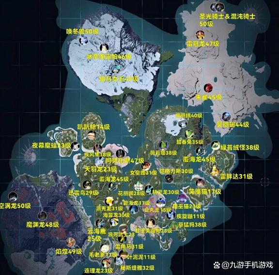 各個傳說BOSS帕魯你可以參照這張插圖去尋找,如果你的地圖已經探索的差不多了,它們也會在大地圖用顯眼的圖標標注出來。首次挑戰會有額外經驗值獎勵,每次捕捉或擊殺后都會有1小時的重生倒計時,你可以根據自身的等級有選擇的去挑戰。