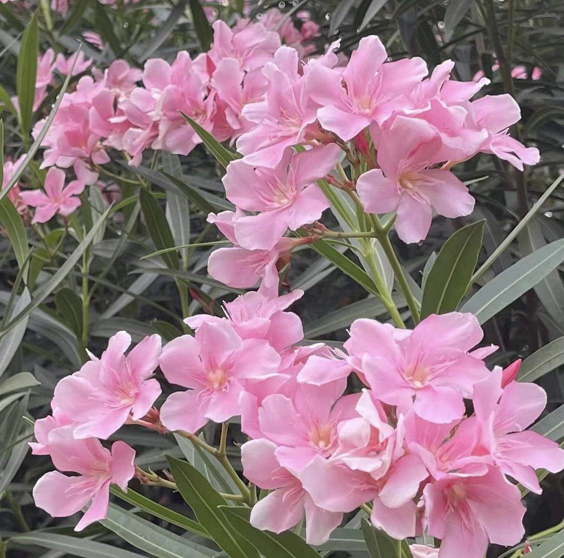 夾竹桃的花色有粉色有白色,看起來仙氣飄飄,粉粉嫩嫩,清麗脫俗,盛開的時候美不勝收,令人賞心悅目。但是這種話,只看不摸最安全。夾竹桃中含有多種強心苷,整株都有毒,傷口中流出來的汁液,毒性很大,不要用手去觸碰,一旦觸碰一定要清洗干凈,避免誤食到口中,不然也存在危險。 |