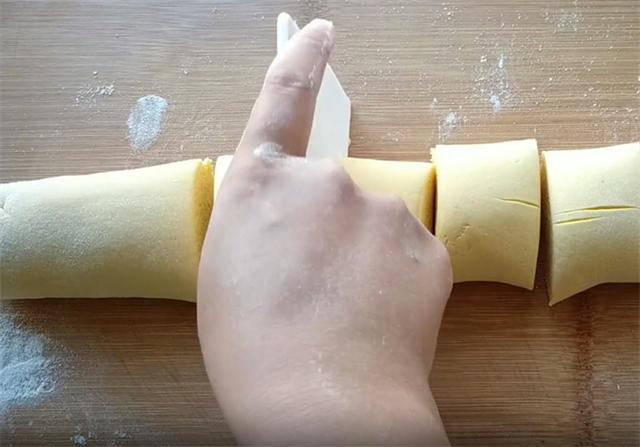 2.待面團發酵完成后,移至案板上揉搓排氣,這個發面的過程也就相當于醒面,大家可以看到這個時候的面團面筋含量就相對多一些,而且也更柔軟了,接著,將面團搓成長條狀,均勻分割成八個小劑子。(www.Ws46.com)