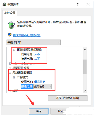 8、把使計(jì)算機(jī)進(jìn)入睡眠狀態(tài)改為從不,把無線適配器設(shè)置改為高性能;電源設(shè)置里把關(guān)閉顯示器后進(jìn)入睡眠改為"從不"