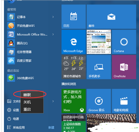 6、然后點(diǎn)擊Windows 10“開始”菜單中的“睡眠”,即可進(jìn)入離開模式了。你可以點(diǎn)擊開始下載任務(wù),然后睡眠。節(jié)電又不損耗電腦。