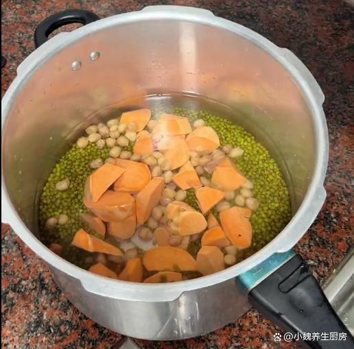 進入5月底,夏季的感覺非常濃厚了,氣溫也快速攀升,溫度已經到底30攝氏度,很多人都開始穿短褲,這個時候天氣非常炎熱,讓人不想出門,西瓜和冰棒是標配,但是不能天天吃。夏季來臨以后,暑氣難消,可以給家里人嘗嘗這款消暑湯——紅薯花生綠豆粥,做法簡單,老少皆宜,別不懂吃。入夏后,綠豆和它是絕配,等于“消暑方”,清涼解暑,早食早受益。  【紅薯花生綠豆粥的制作過程】 食材清單:選購新鮮紅薯幾個(紅薯又叫苕,是一種很受歡迎的食材,分為白心紅薯和紅心紅薯,紅心紅薯吃起來更甜一些,口感特別軟糯,可以做成紅薯餅,紅薯面窩,紅薯發糕或蒸著吃,其實煮著吃營養更容易被消化),選購一小碗綠豆(綠豆是夏季必備的食材,具有清熱解毒,消暑降溫的效果,綠豆一般做成綠豆沙或綠豆粥,我們家兒子超愛吃),花生30克左右,少許純凈水,冰糖少許,百合10克,其他。 正確制作過程:第一步:提前選購好紅薯,花生,綠豆和百合等食材,先把紅薯外皮洗干凈,用刀削掉外皮,去掉凹陷的黑點,反復清洗干凈,切成若干滾刀塊,放在碗中備用。第二步:將花生米用溫水泡發,泡發后的花生米更快煮熟,百合也用溫水泡發開,去掉表面一層半透明物質,放在一邊備用。 第三步:將綠豆用清水洗凈,然后直接浸泡3個小時,提前一晚上放在冰箱冷藏,這湯綠豆更容易出沙,色澤會非常好看。