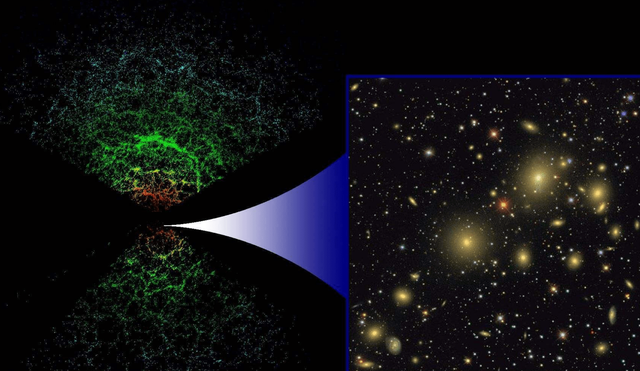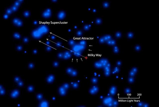 其中室女座超星系團直徑1.1億光年,內部包含了4.7萬個星系,夏普力超星系團直徑1.2億光年,內部包含了8萬個星系,在可觀測宇宙直徑不過930億光年的情況下,這兩個星系團能攪動的范圍相當于全宇宙的千分之二左右,也只有這種橫跨數億光年的天體系統之間的碰撞,產生的震蕩波才能沿著宇宙長城在全宇宙擴散。 是宇宙長城之間的空洞。