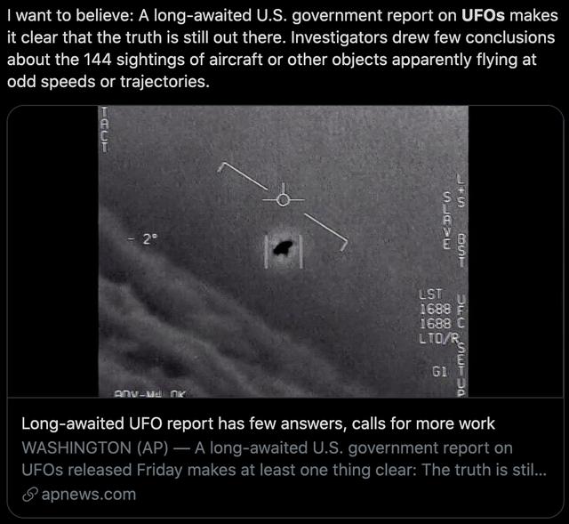 位于我國貴州大山深處的中國天眼,是人類目前最強大的射電望遠鏡,已經分析完了兩組信號。 事實上外星文明和UFO最近的消息來自于美國,美國在2021年發布了一份關于UFO的報告,這些UFO在過去的幾十年里一直存在,這份報告標志著美國政府首次公開承認了這些奇特的UFO。