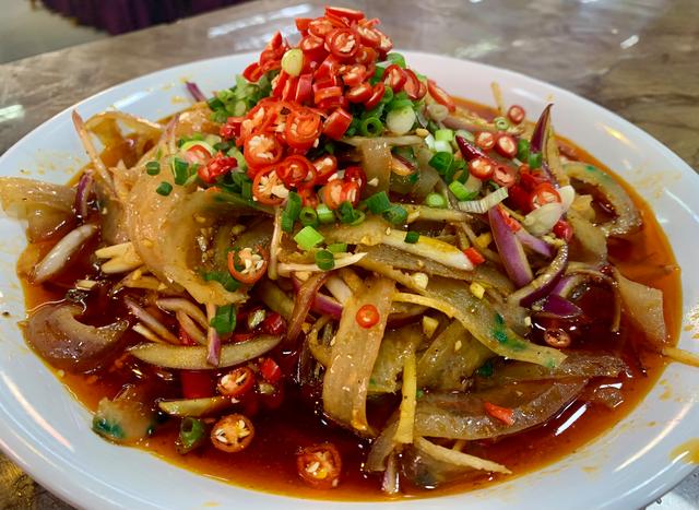 4. 麻辣豬皮 麻辣豬皮是一道香辣可口的川菜。將處理干凈的豬皮切成小塊,用姜片、蒜末、花椒、干辣椒爆炒出香味,然后加入生抽、料酒、鹽、糖等調(diào)料翻炒均勻即可。最后撒上蔥花增加口感。 5. 酸辣豬皮