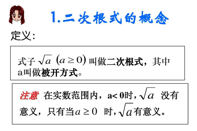 二次根式是指形如√a的數學表達式,其中a是一個非負實數。這個表達式的意思是,找到一個非負實數x,使得x的平方等于a。因此,二次根式通常被稱為“根號下a”的平方根。例如,√4=2,因為2的平方等于4。
