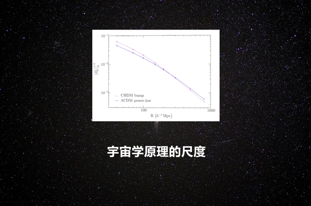 讓我們從宇宙學原理開始,談談這些新的觀測結果。事實上,宇宙在任何地方看起來都不一樣,例如我們腳下的物質就與頭頂上的不一樣。物理學家也注意到了這一點,因此宇宙學原理更準確來說,是當你在足夠大的距離進行平均時,宇宙中的物質是均勻分布的。讓我們來舉個例子。 科學家可以使用協調(diào)模型來計算這個距離,這是目前公認的宇宙學標準模型,它通常也被稱為ΛCDM,其中Λ是宇宙學常數,而CDM代表冷暗物質。根據2010年Hunt和Sarkar的一篇論文,宇宙學原理與物質真實分布之間的距離是根據協調模型計算出來的。他們發現,從大約200-300Mpc的平均距離開始,與均勻分布的偏差低于百分之一。300Mpc大約是10億光年的距離。如果協調模型是正確的話,那么從這個距離開始,宇宙學原理應該得到很好的滿足。