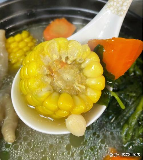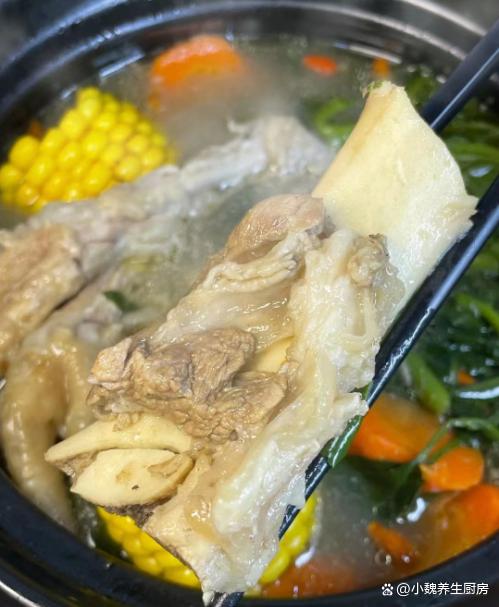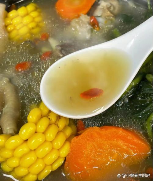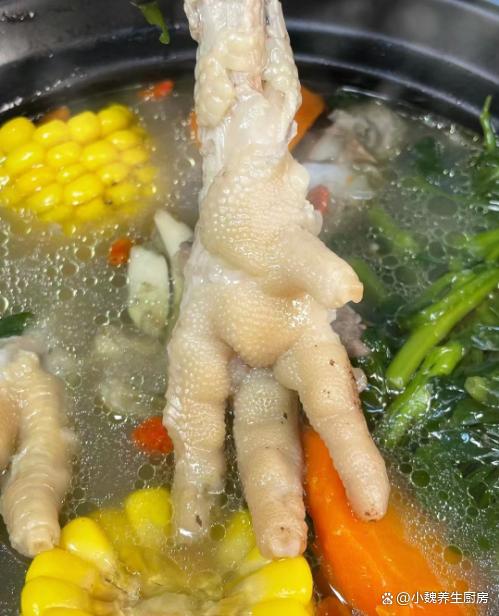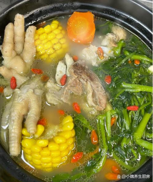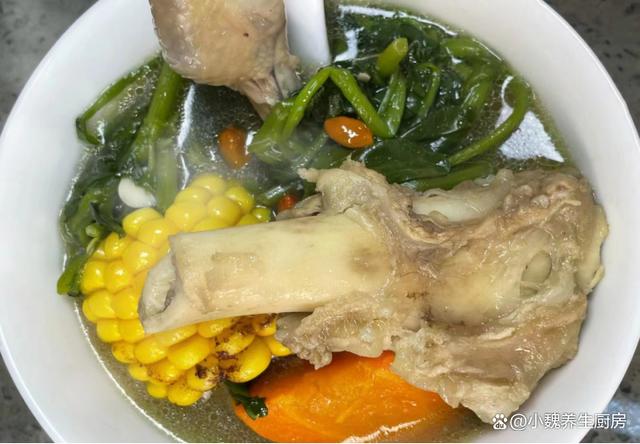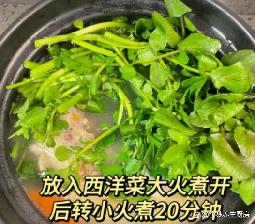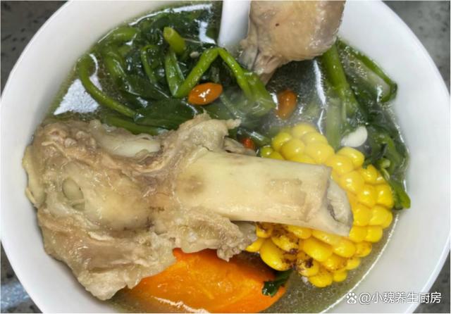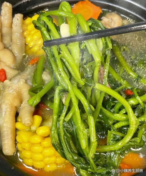 轉(zhuǎn)眼已經(jīng)到了年末,12月中旬過后,已經(jīng)明顯感受到冬日的氣息,冬天給人非常陰冷的感覺,南方人非常不喜歡冬天,早上和晚上非常冷,溫差也非常大,身體的各項(xiàng)機(jī)能下降,嘴巴特別干枯,臉部都被凍傷了,感覺身體缺乏水分和營養(yǎng)。老話說“冬天不補(bǔ),明年受苦”,冬天是非常寒冷的季節(jié),身體非常虛弱,整個(gè)人很不舒服,需要按時(shí)吃飯,多參加體育鍛煉,飲食也要合理搭配,多喝一些暖和和的羹湯,利于各種營養(yǎng)的消化和吸收。今天分享南方人每周必喝的一款家常湯品——西洋菜豬骨雞腳湯,每周燉一鍋,湯汁巨鮮美。“12月一碗湯,明年也不慌”,平常多喝這湯,補(bǔ)足營養(yǎng),安穩(wěn)過冬。  【西洋菜豬骨雞腳湯的食譜解析】 食材明細(xì):選購新鮮西洋菜100克(西洋菜是一種廣東地區(qū)的蔬菜,外地人沒有吃過,西洋菜非常鮮嫩,可以用來炒著吃或者煮湯),選購優(yōu)質(zhì)雞腳200克左右,新鮮豬骨200克左右,枸杞子少許,玉米一根,若干個(gè)椰棗,生姜一大塊,冷水和純凈水少許,南北杏40克,瑤柱30克左右,胡蘿卜2根,少許料酒,香蔥若干根,陳皮6克,食鹽少許,胡椒粉半勺,其他佐料。
