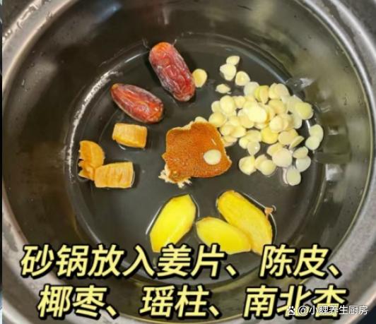 第六步:準(zhǔn)備好煲湯的燉鍋,砂鍋里放入姜片,陳皮,椰棗,南北杏,瑤柱,豬骨,玉米塊和胡蘿卜塊,倒入適量純凈水或開水,大火轉(zhuǎn)小火燉一個(gè)小時(shí)。 來源: www.ws46.com
