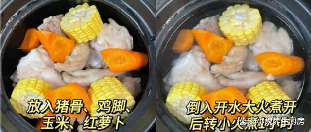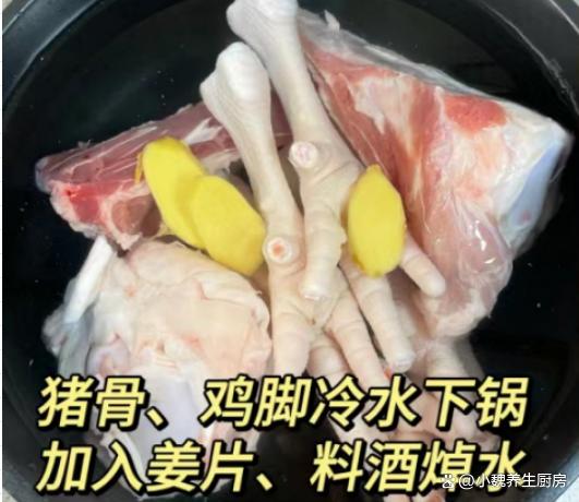 正確制作步驟:第一步:提前選購好西洋菜,豬骨,雞腳和其他配菜,先把雞腳放在容器里,用冷水提前解凍,用剪刀去掉指尖,這樣吃起來更加干凈。第二步:提前把玉米的葉子剝掉,撕掉玉米須,反復(fù)清洗干凈,切成若干塊狀,椰棗用清水洗凈,陳皮提前溫水泡發(fā),刮掉一層白色的瓤,洗凈備用。第三步:將生姜切成一些片狀,南北杏洗凈,瑤柱提前溫水泡發(fā),兩根胡蘿卜清洗干凈,削掉外皮切成滾刀塊,備用。第四步:把豬骨提前剁成塊,用冷水沖洗干凈,掐掉西洋菜的根部和黃葉,用鹽水浸泡一會兒,去掉蔬菜的殘留濃郁,洗凈控干水分、 第五步:豬骨和雞腳放在鍋中,加上適量冷水漫過食材,放入一些姜片,調(diào)入適量料酒,把兩種食材焯燙處理,撈出用溫水沖洗幾遍,準(zhǔn)備好上述一些煲湯的食材,開始制作這道西洋菜豬骨雞腳湯。