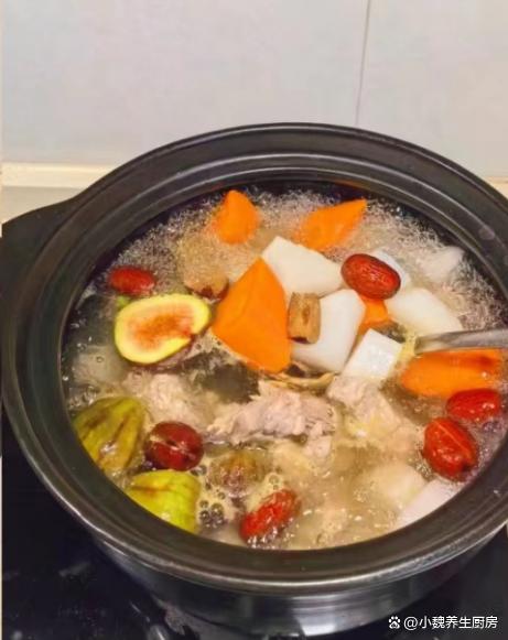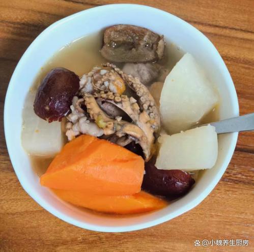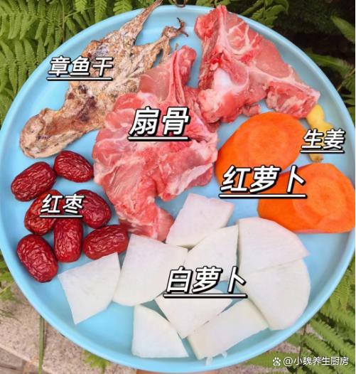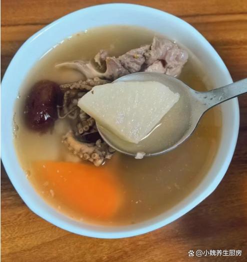 進入寒冬12月,每年到了一年的最后一個月,將要迎來最寒冷的時候,氣溫越來越低,南北方都陸續(xù)降溫了,各地大雪紛飛,寒意濃濃,感覺這幾天突然變冷了,要拿出羽絨服御寒,由于南方?jīng)]有地暖,只能依靠空調(diào)和暖風扇來抵抗寒冬。寒冷的冬天,手腳都被凍傷了,身體想要暖和和,一定要吃熱氣騰騰的飯菜,除了吃火鍋之外,燉湯是許多人的最優(yōu)選擇,湯汁里全部是營養(yǎng),更加利于營養(yǎng)的吸收,增強我們身體的抵抗力。天冷后,有錢沒錢,建議要多喝這湯,滋補養(yǎng)人,舒服度過冬天。  【蘿卜章魚紅棗豬骨湯的食譜解析】 食材明細:選購新鮮白蘿卜一個,胡蘿卜2根,紅棗若干個,章魚干120克(章魚干是一種干制的海鮮,價格雖然貴一些,但是營養(yǎng)價值很高,幫助補充氣血,對我們身體有好處),溫水少許,食用堿少許,冷水和純凈水足量,新鮮無花果若干個,新鮮豬骨400克左右(豬骨是秋冬用來煲湯的首選,豬骨要提前處理干凈,還要掌握好煲湯的火候),料酒少許,生姜15克左右,少許食鹽,一丟丟胡椒粉,大蔥半根,其他。