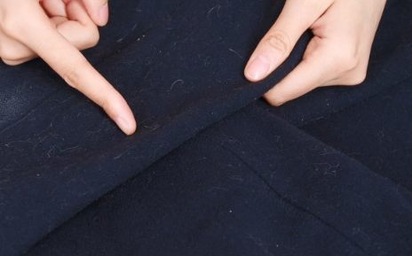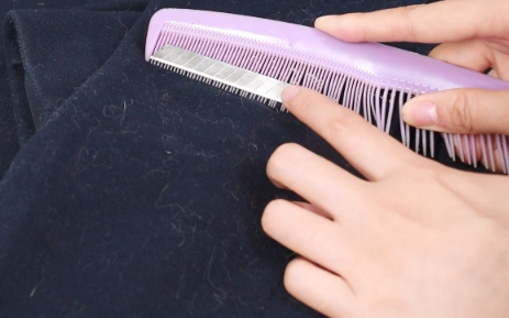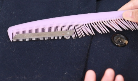 第三步:最后我們將梳子放在衣服上面,有刀片的一面朝上放置,然后像梳頭發一樣慢慢的往下梳就可以了,可以看到衣服上的毛球全都去除干凈了。