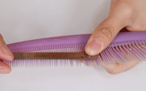 第二步:然后將貼有雙面膠的刀片粘在一把梳子上,可以用家里的廢舊梳子,刀口要距離梳齒頂部0.5cm才行,如下圖所示這樣一個自制的去毛器就做好了。