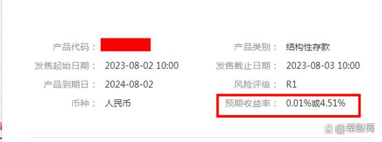 該結構性存款期限為364天,預期收益率最高能達到4.51%,如果剛好在產品到期時觸發收益率達到4.51%的條件,那么存10萬一年的利息差不多也就是4500元了。