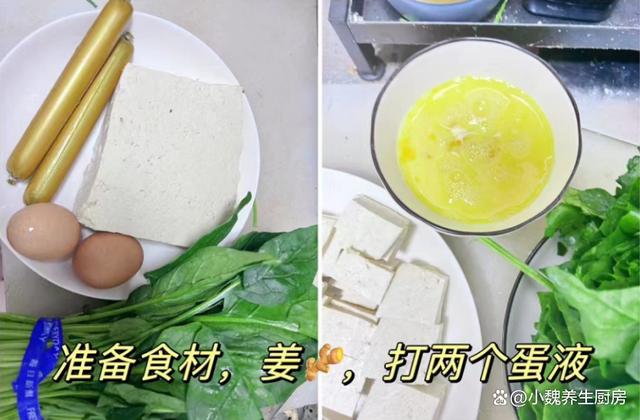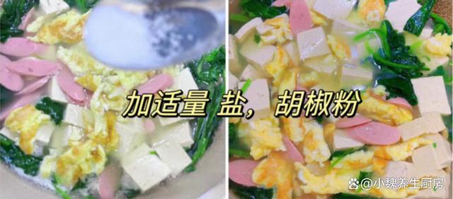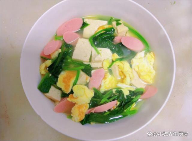 十月以后,到了中下旬,秋天的感覺特別濃郁,冷空氣來襲,秋雨來臨,氣溫也隨之降低,早晚溫差越來越大,早上就感覺天氣霧氣蒙蒙,晚上陰冷潮濕,我們要注意天氣變化,記得多穿一些衣服,避免身體著涼以后,出現生病的情況。  只要人上了年紀,身體會非常脆弱,抵抗力很差,想要身體保持健康,安穩地度過秋冬季節,一定要適當的溫補身體,多喝一些暖和的羹湯,比吃大魚大肉更管用。小編今天為大家伙推薦一款家常鮮湯——菠菜火腿腸雞蛋豆腐湯,主要選用菠菜,豆腐,雞蛋和火腿腸制作而成,湯汁巨鮮美,營養很全面,多給家里人喝它。許多人還不會烹飪這款鮮湯,快一點跟著小編學起來哦。秋天進補,建議要多喝這湯,高鈣高蛋白,補足營養,順利度秋。 【菠菜火腿腸雞蛋豆腐湯的具體做法】 食材明細:選購2根火腿腸,土雞蛋2枚,水淀粉少許,冷水足量,挑選新鮮菠菜一小把(菠菜是秋季最受歡迎的綠色蔬菜,鈣含量和維生素C含量高,菠菜的葉子非常鮮嫩,可以素炒或煮湯),嫩豆腐半塊,雞精半勺,少許食鹽,食用油若干,半勺白醋,生姜兩片,溫開水少許,味極鮮半勺,其他調味品。 具體制作步驟: