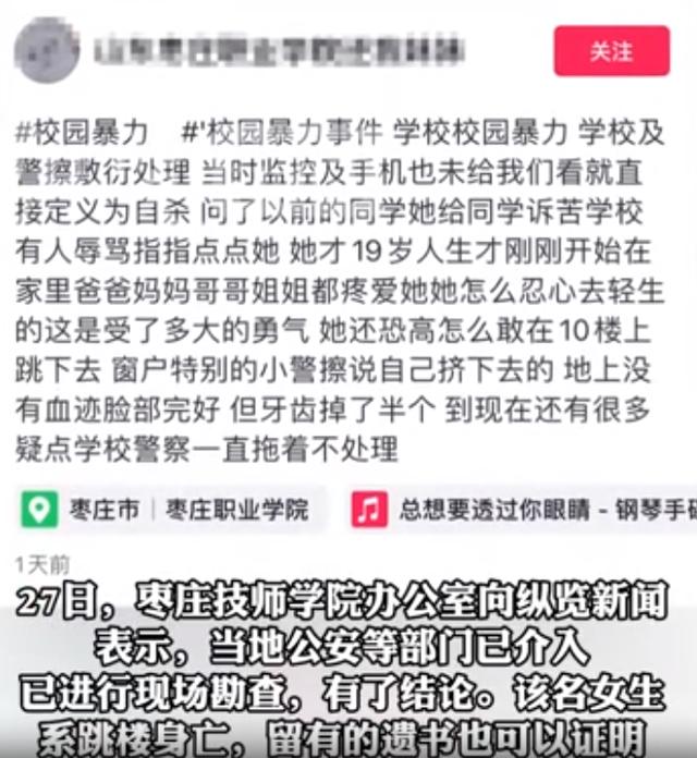 據(jù)校方表示,這名女學生的跳樓身亡是一起自殺事件,沒有兇手。對于這樣的處理方式,死者的家屬表示無法接受。他們認為,學校應該對此事件進行深入的調查,而不是簡單地歸結為自殺。因為死者從小就非常優(yōu)秀,沒有理由會選擇這樣的方式結束自己的生命。而且,據(jù)家屬透露,死者在生前曾經遭受過辱罵、嘲諷等行為,這些行為可能就是導致她自殺的原因。 對此,校方和死者家屬進行了交涉,但仍然沒有達成一致的看法。棗莊技師學院辦公室一位工作人員稱,當?shù)毓惨呀浗槿氪税?,進行了現(xiàn)場勘查,也有了結論。