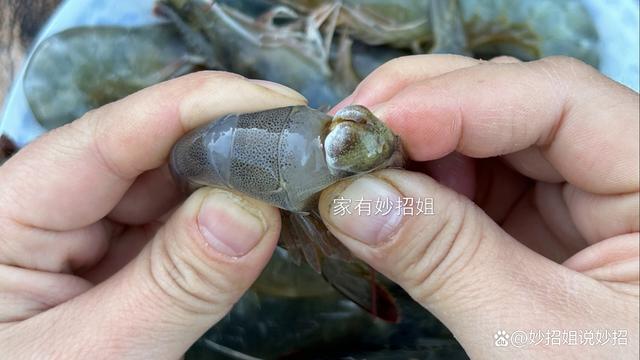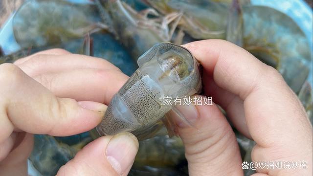 接下來,我們用抓住蝦頭的手擠壓一下,這樣里面的蝦包就被擠壓了出來。