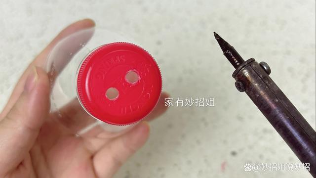 然后我們再將瓶子的瓶蓋擰下來,用電烙鐵在瓶蓋的中間戳上兩個洞。