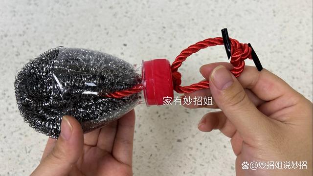 繩子穿出來后,將瓶蓋擰緊,再把繩子拉緊并打上一個結。接下來,我們再繩子的末端也同樣的打上一個結,這樣一個刷鍋的神器就完成了。