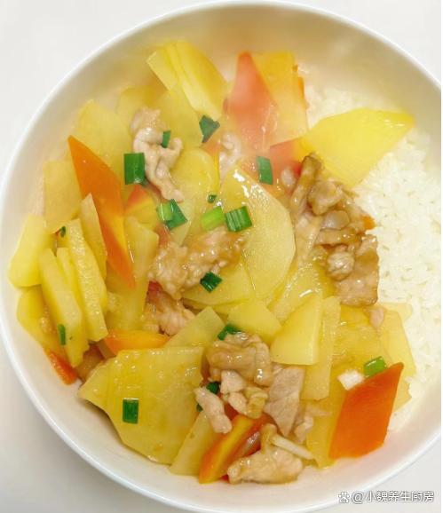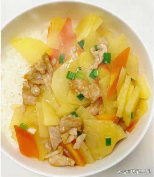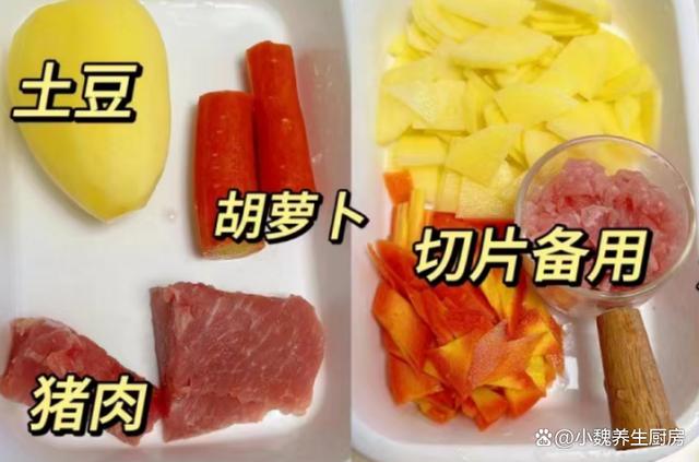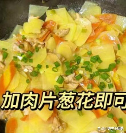 進入9月的尾聲,九月是秋天的開始,現在終于感受到秋天的涼意,外面的葉子開始泛黃和凋落,金燦燦的景觀太美了,天氣開始降溫了,感覺非常涼爽。秋天是一年最舒服的日子,送走酷暑,處于炎熱和寒冷季節的過渡階段,我們也需要營養,如果平常胃口差,不要只知道吃外賣,可以給家里人做飯吃,建議要嘗嘗這道家常菜——胡蘿卜土豆片炒肉片,幾分鐘就搞定,吃起來超級下飯。秋天,別總是點外賣!給家人吃這菜,葷素搭配,解饞開胃超下飯。  【胡蘿卜土豆片炒肉片的詳細做法】 食材明細:選購兩根胡蘿卜(或者選擇紅蘿卜,胡蘿卜吃起來特別清甜,其中富含大量的胡蘿卜素,這種物質對于眼睛很有好處,保護孩子的視力,食用方法還非常多),優質大土豆300克(土豆要選擇外皮光滑,色澤均勻,捏起來硬硬的,吃起來口感更脆一些),選購150克優質里脊肉(可以選擇豬肉里脊或牛肉里脊,肉質都很嫩滑,是這道菜肴的最佳選擇),生抽少許,蠔油少許,少許清水,適量淀粉或生粉,植物油少許,姜蒜少許,幾根香蔥,其他調味品。 正確烹飪順序: 第一步:提前選購好土豆,胡蘿卜和里脊肉,把土豆全部去掉,挖掉一些黑點,反復清洗干凈,切成若干菱形片。第二步:土豆片放在容器里,加上適量清水浸泡,搓洗掉里面的淀粉,或者將其焯水處理,這樣口感更好,最后要控干水分。第三步:胡蘿卜切掉兩頭洗凈,去皮切成菱形片,香蔥洗凈切成蔥段,姜蒜切成若干細末,備用。 第四步:把豬肉里脊洗干凈,改刀切成若干薄片,放入到容器里,加上生抽和蠔油少許,加上半勺料酒,加上淀粉和食用油,加上一丟丟食鹽,讓肉片充分拌均勻,腌制半刻鐘。 第五步:鍋底提前燒熱,油溫慢慢燒熱,加上蔥姜蒜爆香,倒入豬肉片爆香,肉片炒至色澤變色,盛出備用。 第六步:起鍋加上油,倒入胡蘿卜炒至斷生,然后倒入土豆片,用鍋鏟一起煸炒,最后倒入炒熟的肉片。