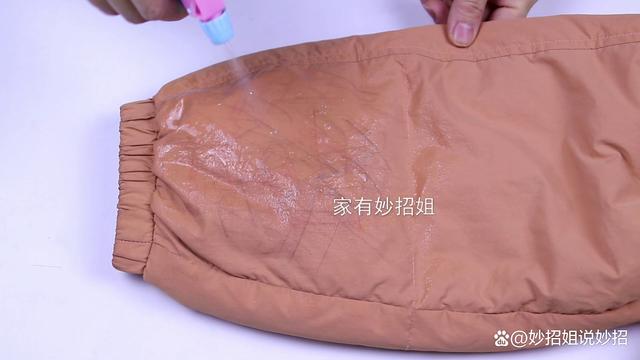 接下來(lái),我們只需要將要清洗的羽絨服平鋪在桌面,然后在臟的地方均勻的噴灑剛剛調(diào)制好的溶液,可以稍微多噴上一點(diǎn)。