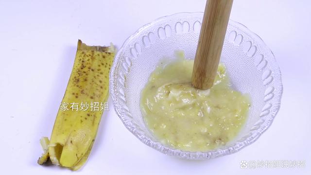 當香蕉放置的時間長了,它的表面就會長出很多霉點,而香蕉內部的果肉也會變黑,不能食用了。這樣的香蕉我們也不要扔,先將爛掉的香蕉皮剝掉,剝下來后放一邊,等下還可以利用到。接著,我們再準備一個容器,把剝好的香蕉掰成小段的放在容器中,再拿根搟面杖,用搟面杖將香蕉搟一搟,搟成香蕉泥。