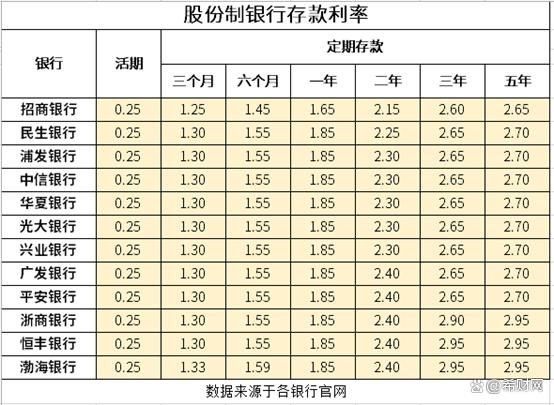 三家股份制銀行存款利率集體下調這三家宣布存款利率下調的股份制銀行,分別是渤海銀行、浙商銀行和恒豐銀行,其中渤海銀行的存款利率降幅是最大的。下方為三家銀行最新存款利率表: