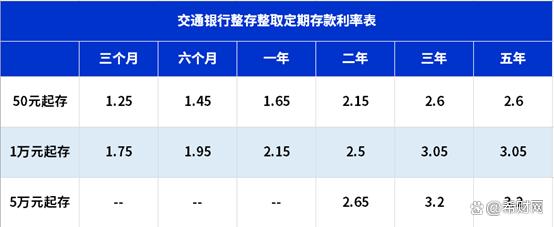 所以,交通銀行普通的整存整取定期存款的利率雖然沒什么變化,但因為增加了1萬元和5萬元起存的,所以實際的存款利率整體上是有所提升的。 從這個利率表上看,如果想要多拿利息,那么最好就是存5萬元起存的。只不過,5萬元起存的不能存一年期及以下的產品,如果要存這些期限的,就只能存1萬元起存的了。 其實不管是5萬元起存還是1萬元起存的,利息都不算低,甚至有不少中小銀行的存款利率還達不到這個水平,所以都是可以存的???0元起存的,利息就完全沒有優勢了。 那么,除了1萬元和5萬元起存的整存整取的定期存款外,交通銀行還有什么存款產品的利息相對較高呢?