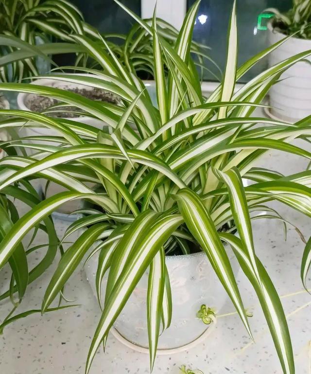 吊蘭可以養在家里的客廳,陽臺或書房,如果家里沒有空間的話,完全可以放在高處,或者懸掛于空中,你會發現,能顯得更加瀟灑飄逸,末端的小吊蘭更是點睛之筆,使得整盆花變得很有立體感,就像一個藝術品一樣,讓環境賦予了更多的生機。