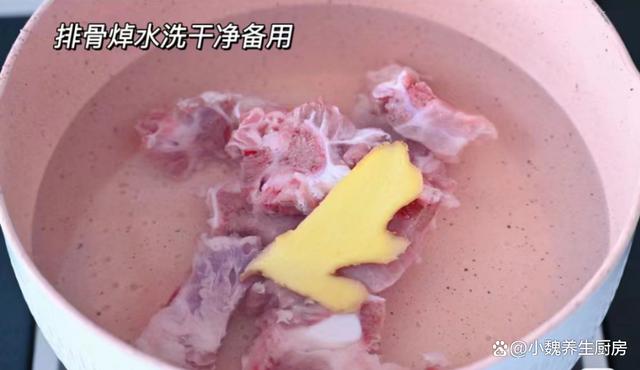 3:太子參和麥冬洗干凈,無花果用溫水泡30分鐘,老姜切成若干片狀,鍋中放入排骨塊,加上冷水600毫升,一定不能熱水下鍋焯燙,將其焯水處理,逼出里面的血沫,準備好幾種食材和排骨塊,開始制作這款胡蘿卜太子參無花果燉排骨湯。