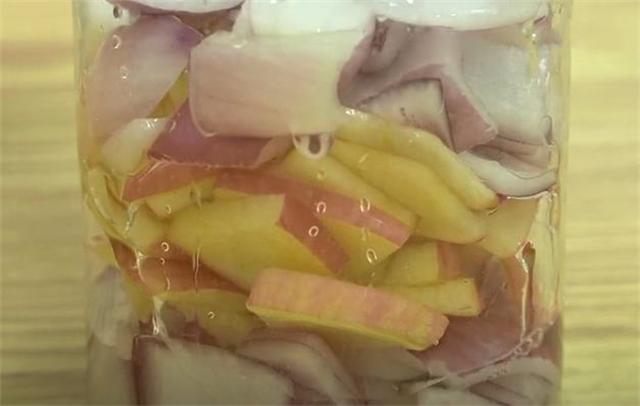 4.準備一個無水無油的消毒容器,底部鋪上洋蔥,再放上一層蘋果,最上面放上洋蔥,不要放的太滿,最為關鍵一步,準備一瓶釀造米醋,把醋倒入瓶子中,一定要沒過上面的洋蔥,蓋上蓋子,擰緊密封好,晃動一下,這樣可以讓醋泡的更均勻,放冰箱冷藏放五天就可以食用了。