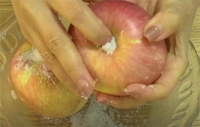 1.準備一個又大又紅的蘋果,加一勺鹽,把蘋果涂抹均勻,反復揉搓,搓去蘋果皮上果蠟和雜質,鹽還有殺菌的作用,蘋果皮含有豐富的膳食纖維和自然抗氧化劑,所以咱們在使用蘋果的時候,不要把蘋果皮去掉。