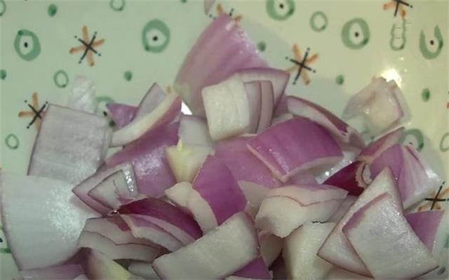 3.再準備一個紫皮的洋蔥,這種洋蔥花青素含量很高,一分為二切成片,最后切成丁,洋蔥味比較辛辣,富含粗纖維和維生素,對我們的減肥有很好的幫助,切好后把它們抖散開,裝入盤中。
