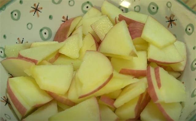 2.搓完以后再沖洗干凈,把蘋果分成4份,把里面的核去掉,切成薄片,多吃蘋果對身體特別好,還有豐富的維生素,切好后全部放入碗中備用。