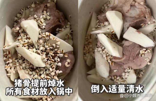 4:湯鍋里放入豬骨,放入薏米和山藥塊,加上足夠的清水,上鍋燉2個小時,記得要大火轉小火。