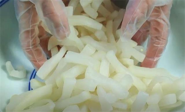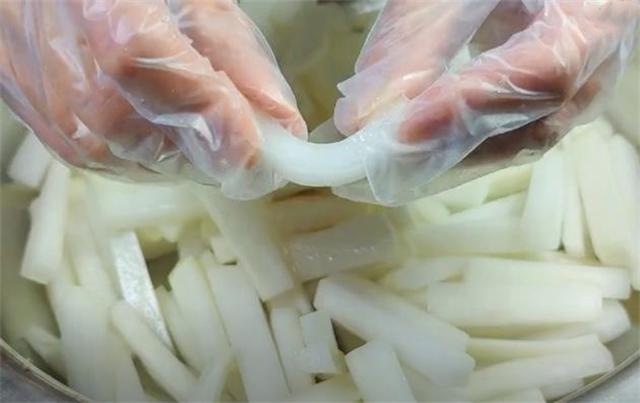 3.這個時候我們的蘿卜條也腌制好了,腌出了很多的水,而蘿卜本身也變得非常柔軟且有韌性。