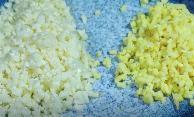 2.接下來我們準備一把的大蒜,先將它切成蒜片,然后再剁成蒜末,剁好之后先裝入盤中備用。此外,我們還需要準備兩小塊生姜,先將生姜切成薄片,然后再切成姜末,切好之后先裝入盤中備用。