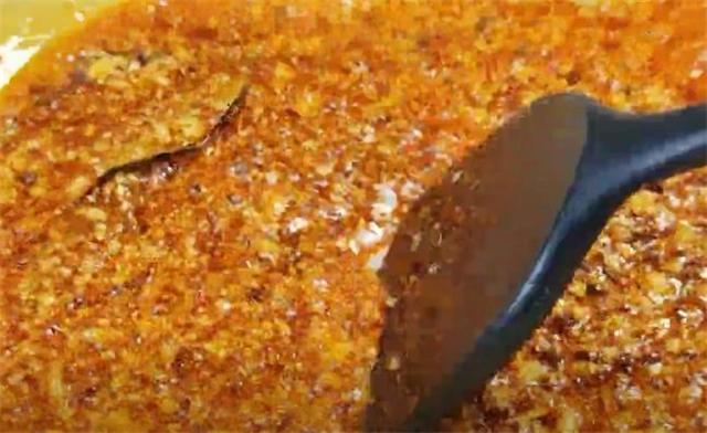 5.在鍋中加入適量的食用油,加入一小把花椒和兩個八角,以及幾片香葉,用鏟子翻動幾下,然后開小火把香料的香味炒出來,炒香之后再把切好的姜蒜末一起加進來,繼續開小火把姜蒜炒出香味,炒香之后再加入辣椒面,適量的白芝麻,稍微的再給它翻炒幾下就可以,炒好之后,先把它放涼備用。